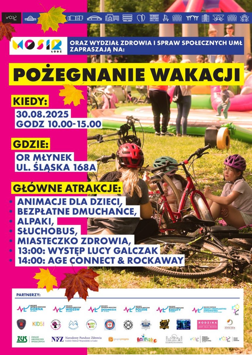 Miejski Ośrodek Sportu i Rekreacji w Łodzi oraz Wydział Zdrowia i Spraw Społecznych UMŁ mają zaszczyt zaprosić wszystkich łodzian na imprezę plenerową o charakterze pikniku rodzinnego, która odbędzie się 30.08.2025 r. na obiekcie rekreacyjnym "Młynek" przy ul. Śląskiej 168A.
